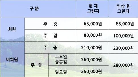 뉴코리아cc 그린피 인상 안내 페이지 정보 작성자 동부회원권거래소 작성일22-09-07 16:56 조회17,922회 댓글0건 관련링크 목록 본문 뉴코리아cc 그린피 인상 안내인상대상 : 회원 및 비회원인상시기 : 2022년 9월 1일부터 목록